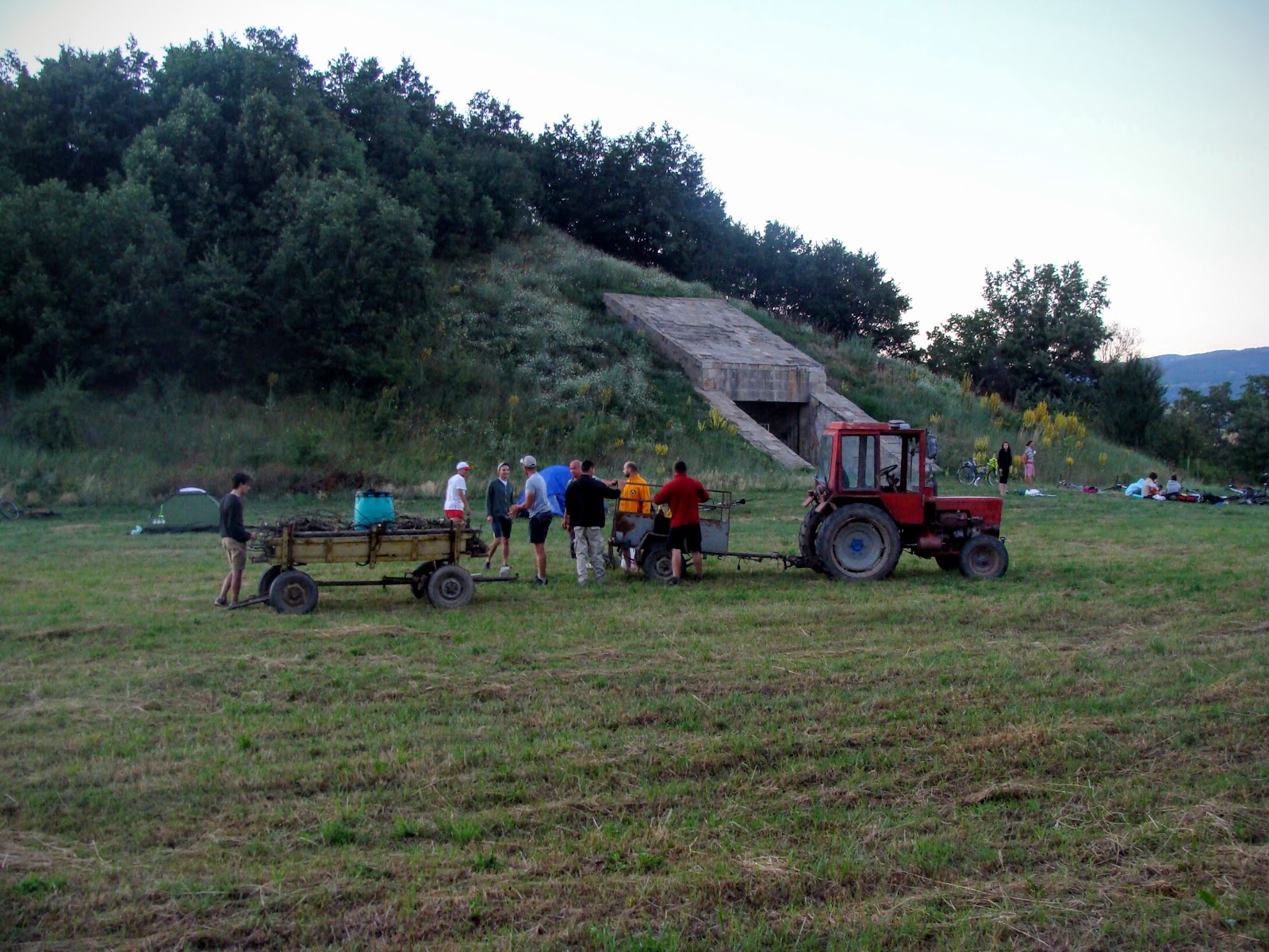 Станах рано по няколко причини. Първо – чувствах се наспан и без махмурлук от смесването на бира и вино, Второ – все пак бях един от организаторите и Трето – днес също щяха да се присъединят хора към карането и трябваше да ги посрещна на гара Септември и докарам и влея в групата. Бях помолил да сложат кафето на лесно, но най-лесното е било нечия раница и за да се събудя си направих „екстракт“ от чай. Отдавна не бях пил чай, но в това съотношение чай-вода би трябвало да е забранено дори в Турция и Индия. Тръгнах към Септември и отново се озовах на „любимият“ частично асфалтиран път между Славовица и Ветрен. Този път заварих техника и работници довършващи работата оставена преди години. До Септември е само спускане, така че бях бърз. От пътническият и бърз влак слязоха трима, а още трима продължиха за Пазарджик и щяхме да се съберем вечерта. Нагоре бе малко по-бавно, но опитвах да поддържам темпо за да можем все някъде да настигнем групата. Притеснявах се за себе си, групата щеше да измине около 63-4 км, но на мен ми се събираха близо 100 км за деня. За мое изумление настигнахме основната група на разклона за Славовица… Всички, включително колегите си бяха добре поспали и тръгнали късно. Вече спокоен и със цялата група започнахме епохално изкачване между Мухово и Оборище. Средна гора е прекрасна дори в най-жаркото лято, но баира беше безпощаден и дълъг. Все пак в ранният следобед бяхме в Оборище, където с няколкото човека с които карахме заедно спряхме за сладолед. До Панагюрище беше вече песен, а основната група даже сядаше на дълга маса в местен ресторант. Вече привечер и по ладно пристигнахме до Стрелча и Жаба могила, където си направихме лагер. Денят приключваше. Бай Кольо, който живее в съседство до могилата и трактора му Борко ни помогнаха с дърва и вода. И копона започна…