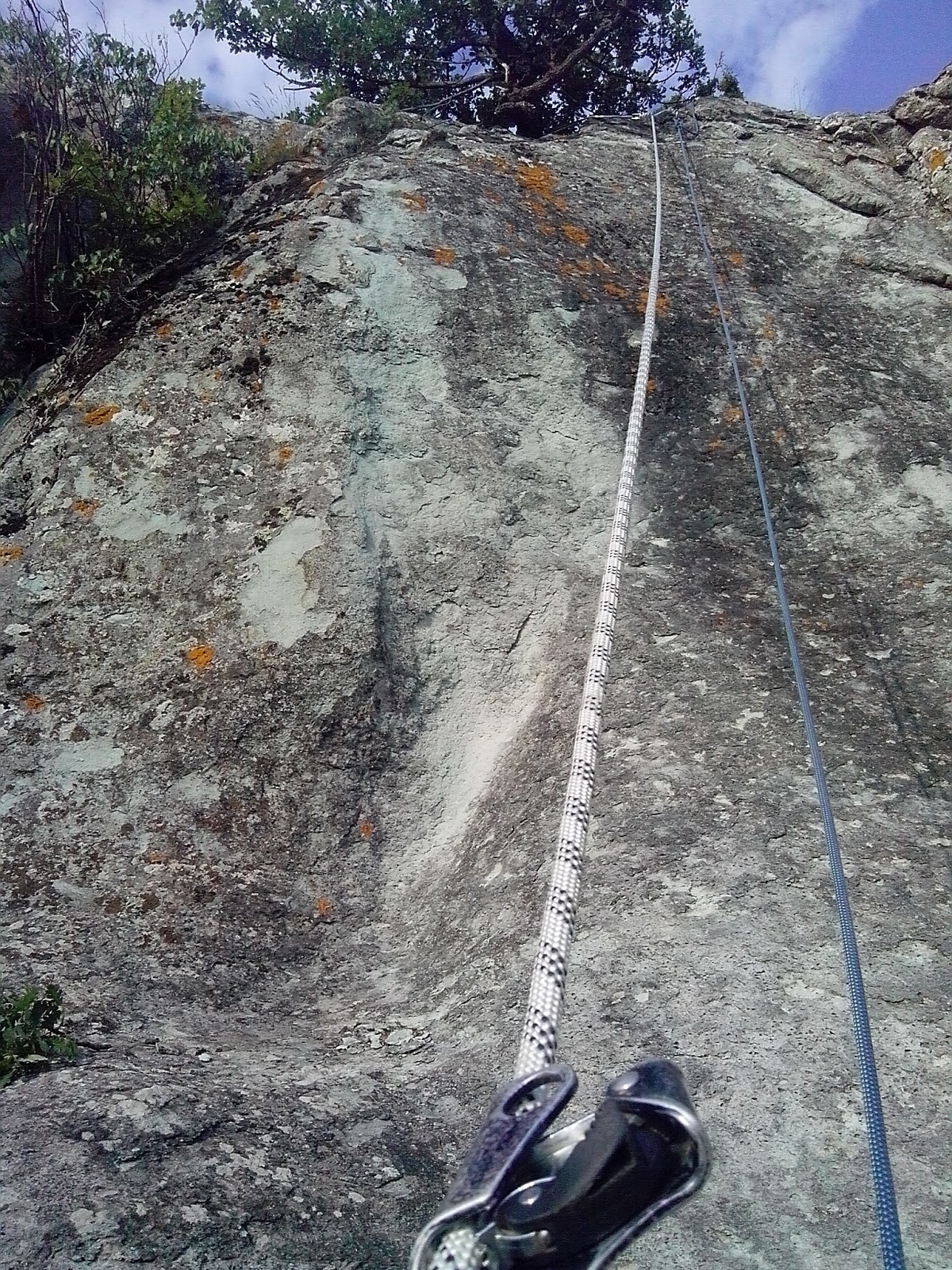 Първият опит да стигнем до халките се оказа неуспешен, така че, се качихме най-отгоре за да пуснем рапел. Носехме 30 м. статично въже и 60 м. динамично (другите въжета останаха в колата). Дори мислех да използвам само 30-метровото, но горе ни очакваше изненада – след ръба на 5 м надолу имаше широка три метрова козирка. И когато пуснахме статичното въже след врорият ръб, то дори не стигна половината от отвеса. Добре… може и по зле да е. Използвах статичното важе за да си направя опори за динамичното, вместо да преекипирам и забивам клинове и да редуцирам елонгацията. Сложих един протектор на вторият ръб и тръгнах надолу. За съжаление халките се оказаха близо под ръба и на около два метра в дълбочина. Невъзможно за пандюл. Понеже екипирах, не снимах с GoPro-то на каската, затова се върнах горе и се пуснах пак. Алекс беше прав -халките бяха същите, като на Шан кая – направени от човешка ръка.